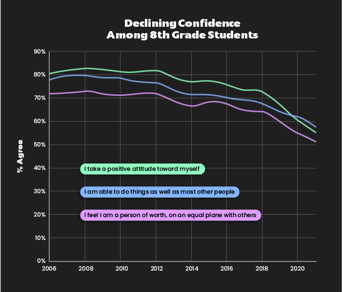 According to Monitoring the Future, a study that’s been tracking 8th-graders’ behaviors and attitudes since 1991, the percentage of kids who take a positive attitude toward themselves, believe they are a person of worth, or think they can do things as well as others has been on the decline over the past ten years, and taken a complete nosedive over the last five. With low confidence comes serious mental health challenges among children, which have increased rapidly over the last decade.